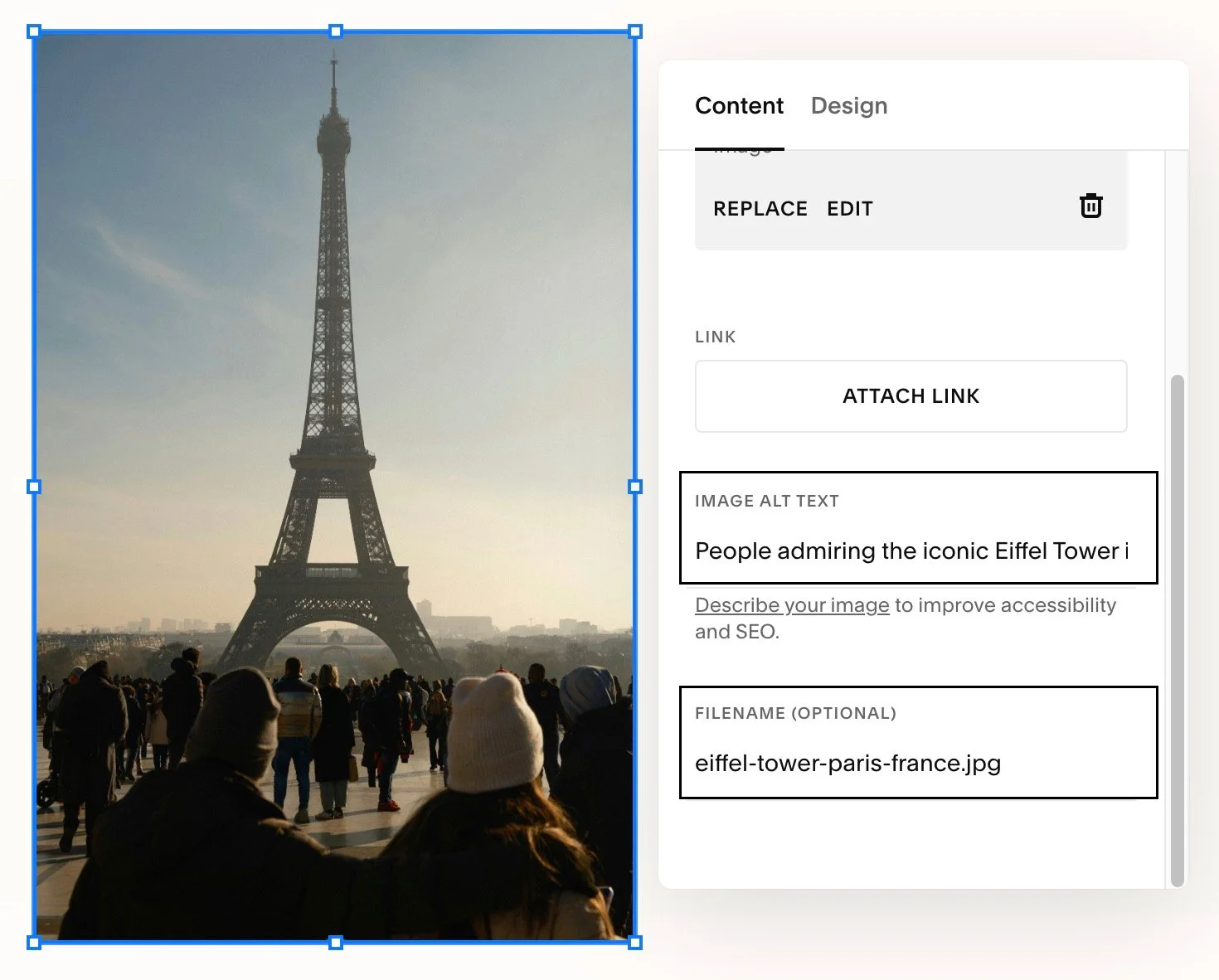 Add "Alt Text" in the image settings. This is a description that screen readers use for accessibility and also helps search engines understand what's in your image.